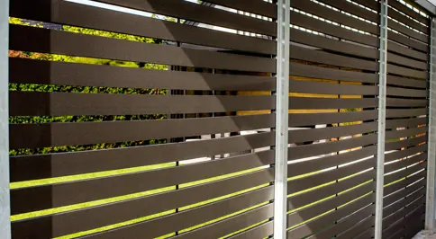 Vælg komposit lamelbeklædning til din overdækning, hvis du ønsker afskærmning og udsyn på én gang. Fås i lys grå og koksgrå.